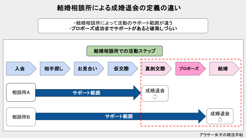どういう状態を成婚(ゴール)とするのかで、結婚相談所がサポートする範囲が大きく変わります。例えば、成婚を「プロポーズを受けるまで」とするか、「交際が開始するまで」でもサポートの質もや範囲も変わりますよね。